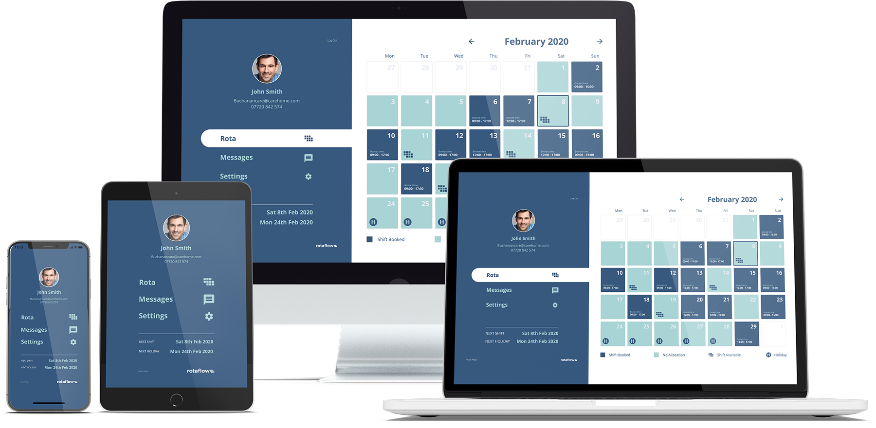 Rotaflow offers a unique staff take on the standard rota and presents an easy to use system designed to be accessible 24/7 on any device. By populating your staff rotas in advance you can allow staff full access to their rota on the go with the ability to request holidays, cover shifts and more. With full compliance reports you can monitor important stats and export to 3rd party systems using our export tool.